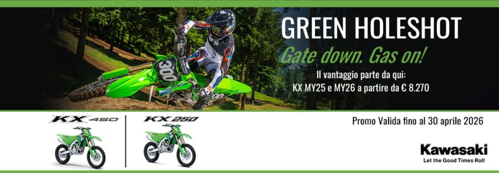 La nuova promozione Green Holeshot porta in pista tutto il carattere della gamma offroad Kawasaki KX.